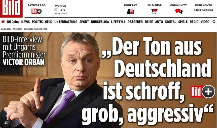 Orbán Viktor miniszterelnökkel közölt interjút csütörtöki számában Bild című német lap „A Németországból érkező hang goromba, durva, agresszív" címmel. A népszavazási kezdeményezéssel kapcsolatban a kormányfő elmondta, hogy nem Európa ellen, hanem a demokrácia érdekében megakadályozza meg az uniós jogot sértő EU-kényszerkvótát. Emmellett úgy véli, hogy nem lehet az emberek feje felett a jövendő nemzedékek életét nagyban megváltoztató döntéseket hozni.